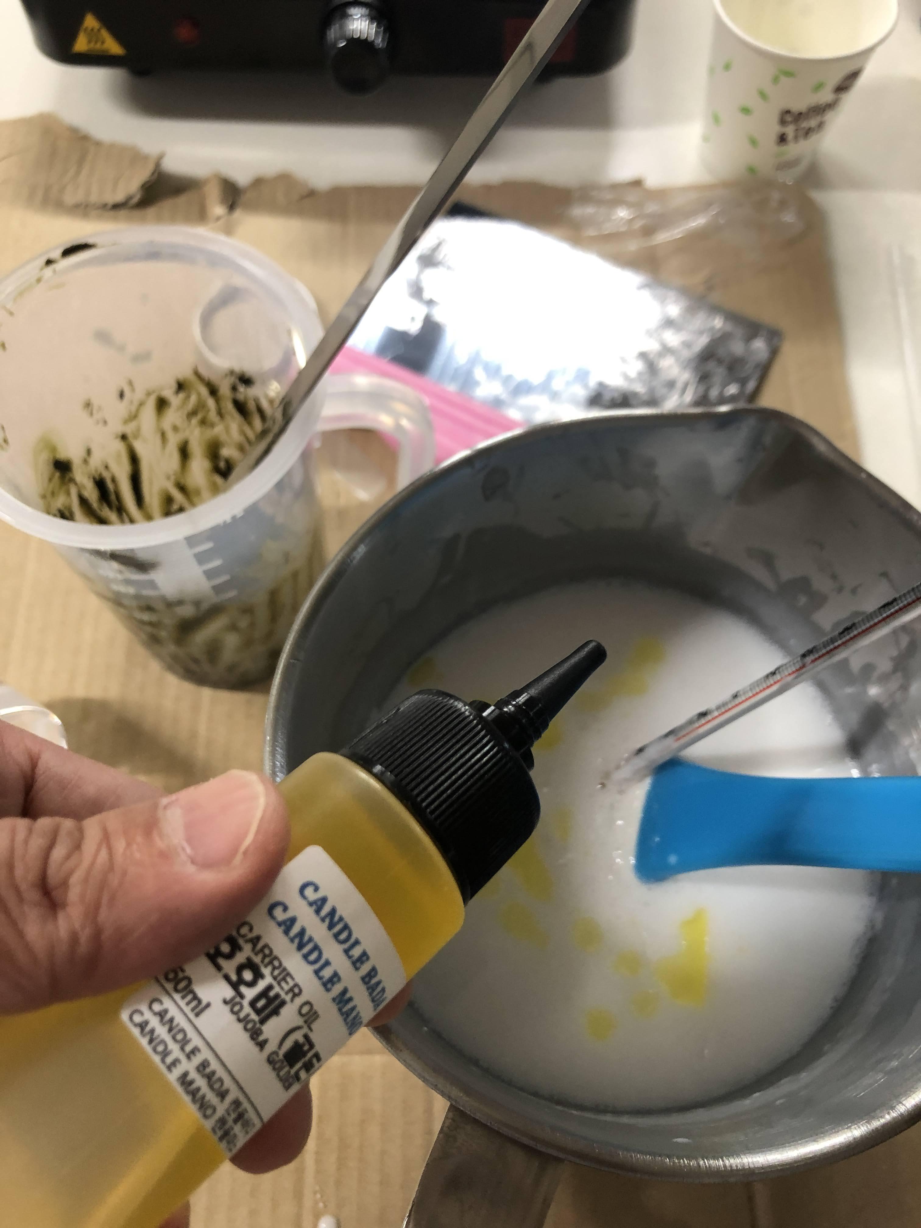 #7. 비누 베이스의 온도가 65도 정도 될 때 호호바 오일과 로즈마리 오일, 버가못을 첨가해줍니다.